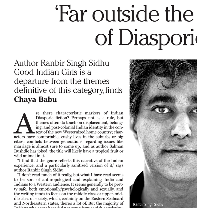 RANBIR SINGH SIDHU (www.ranbirsidhu.com) is the author of Good Indian Girls, and a winner of the Pushcart Prize in Fiction and a New York Foundation for the Arts Fellowship, and other awards. His stories appear in The Georgia Review, Fence, Zyzzyva, The Missouri Review, Other Voices, The Literary Review, Alaska Quarterly Review, The Barcelona Review, The Happy Hypocrite and other journals and anthologies. His work for theater has been supported by MCC Theater, the Edward F. Albee Foundation, the Lower Manhattan Cultural Council, La Mama ETC, the September 11th Fund, and the New York State Council for the Arts among others.